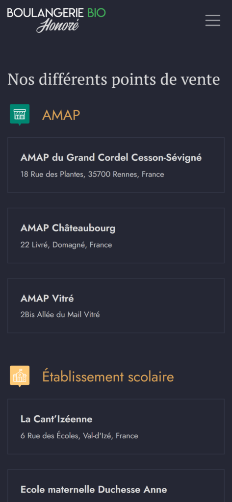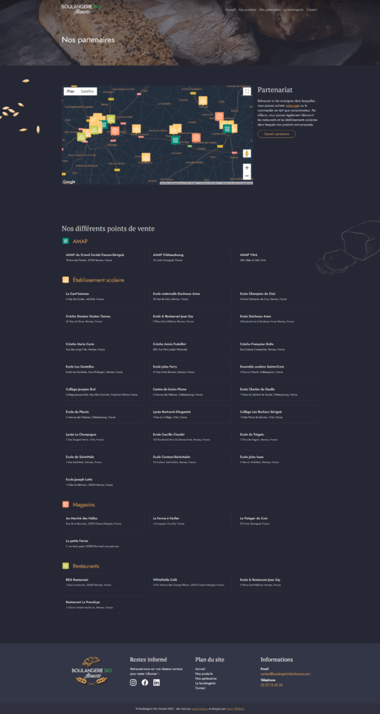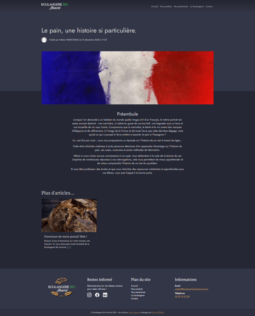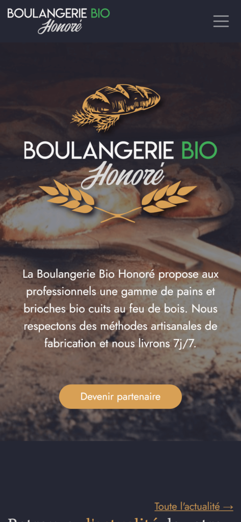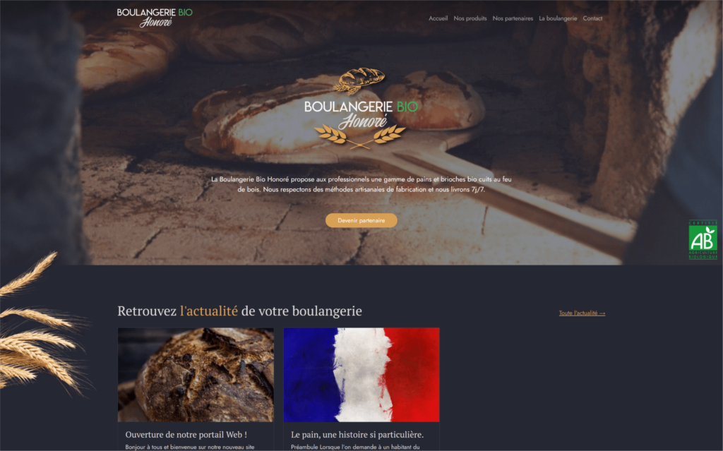 Le challenge du jour ? Créer un site web avec les dernières technologies et évolutif tout en proposant un look travaillé pour faire ressortir le coté ancien et artisanal de la boulangerie ! Le site web permet à la Boulangerie Bio Honoré de présenter tous ses produits et de raconter une incroyable aventure entrepreneuriale d’un jeune boulanger passionné.