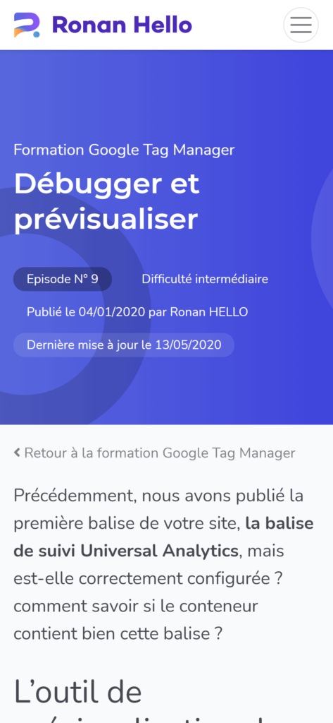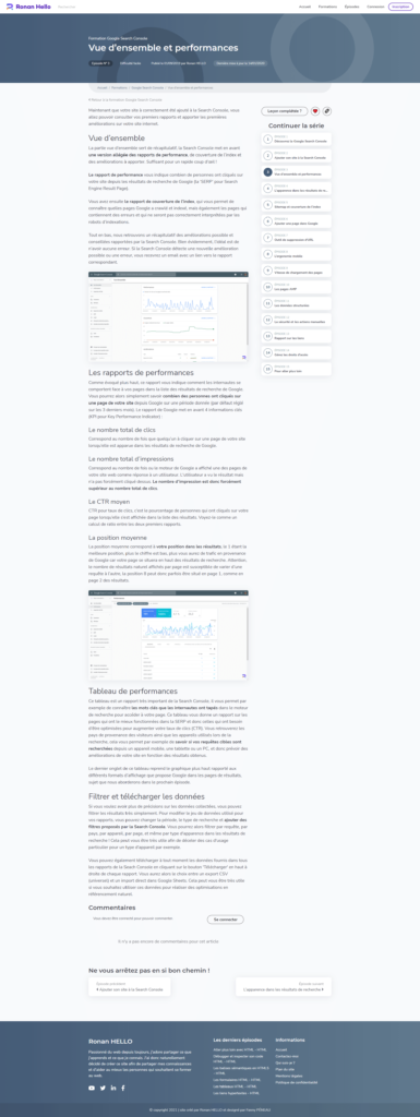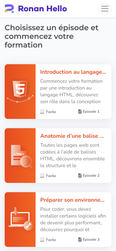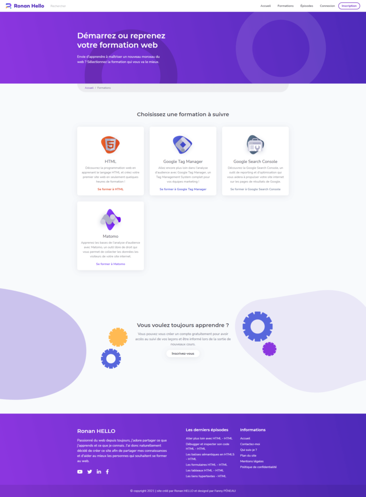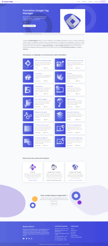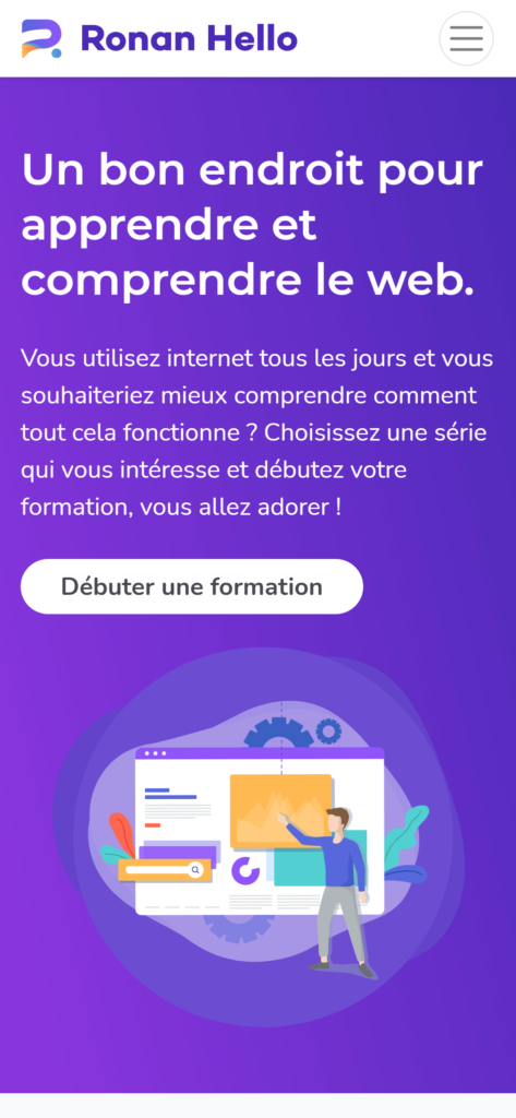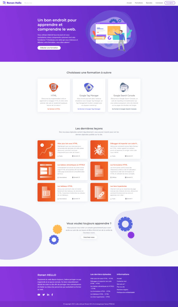 Le site Ronan Hello est une plateforme permettant de se former aux différentes technologies du web en proposant des cours en ligne. Ce site à pour but de proposer du contenu à destination des utilisateurs souhaitant se former aux métiers du web. Le tout au travers d’une interface épurée, minimaliste et dotée d’une navigation intuitive.