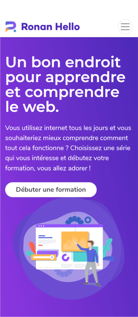 Le site Ronan Hello est une plateforme permettant de se former aux différentes technologies du web en proposant des cours en ligne. Ce site à pour but de proposer du contenu à destination des utilisateurs souhaitant se former aux métiers du web. Le tout au travers d’une interface épurée, minimaliste et dotée d’une navigation intuitive.
