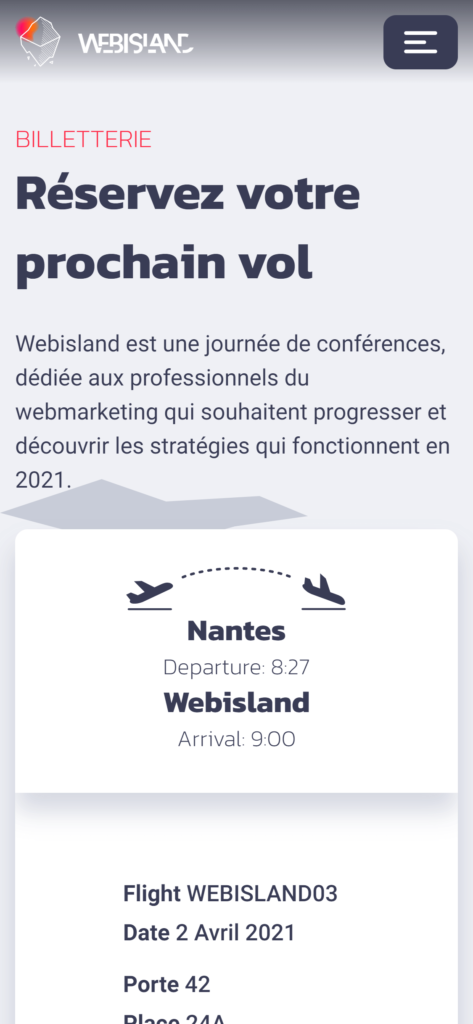 L’événement WebIsland est un événement professionnel et ou règne la bonne ambiance, les participants quittent les salles de conférence heureux et la tête pleine d’idées. C’est cette ambiance festive et professionnelle que nous souhaitions transmettre au travers d’une expérience utilisateur travaillée.