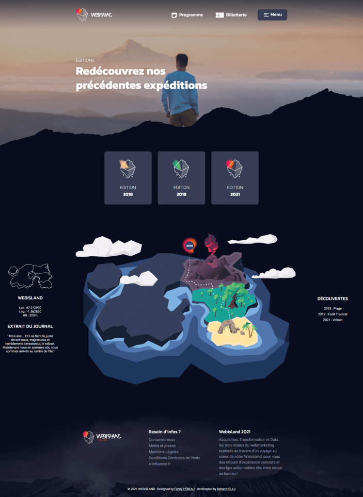 Webisland est un évènement webmarketing sur Nantes qui se déroule pendant une journée sous la forme de conférences. Mais cet évènement c’est aussi chaque année un nouveau thème, une nouvelle partie de l’île et donc une nouvelle ambiance. En collaboration avec Fanny Péneau nous avons créer une véritable expérience qui plonge les utilisateurs dans l’aventure de Webisland, un avant-goût de l’ambiance de l’événement !