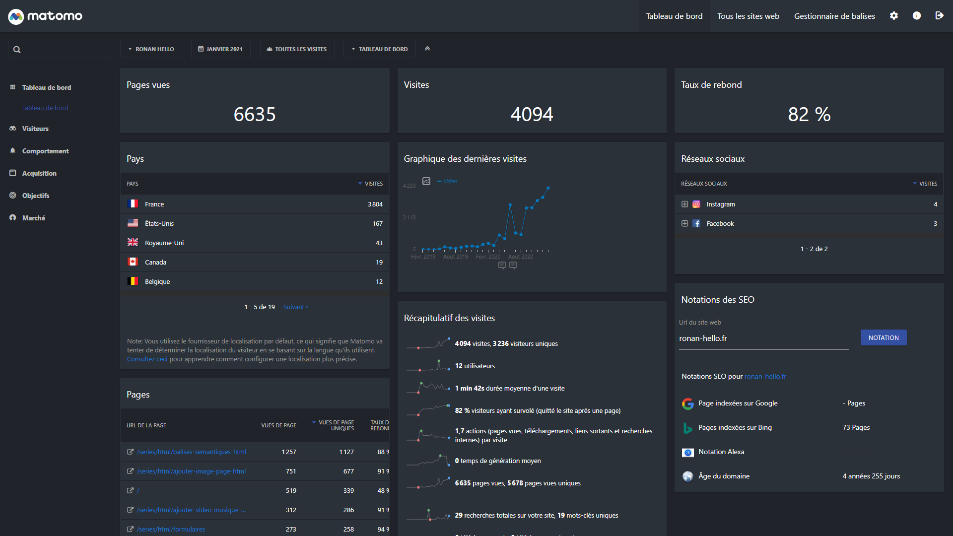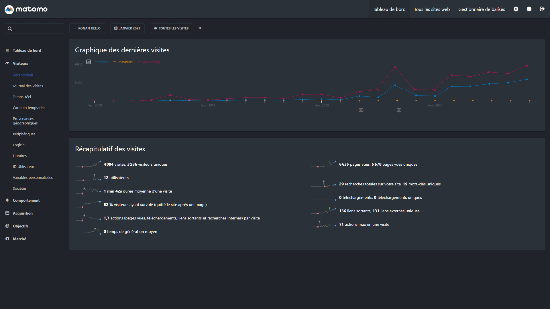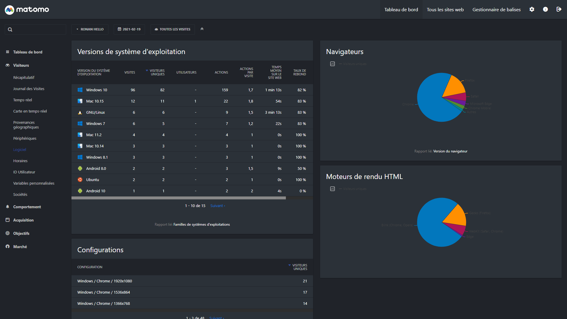 Ce thème complet prend en charge l’intégralité des interfaces de Matomo, les rapports et cartes SVG et plus récemment, l’interface de Matomo Tag Manager et la version responsive de l’outil !